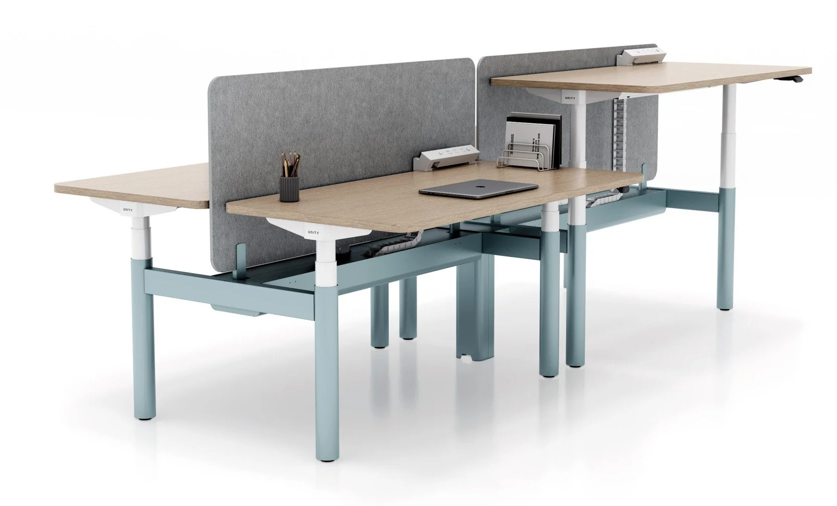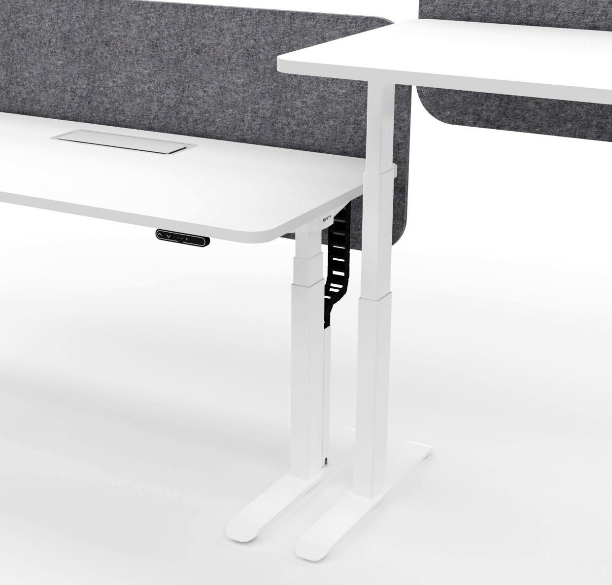 The single-person independent workstation allows users to choose whether to add a screen as needed; The screen can rise and fall with the desktop, synchronously safeguarding individual privacy and psychological safety; When combined face-to-face, the screen is fixed as a whole, effectively defining the separation between individuals and workspaces.
