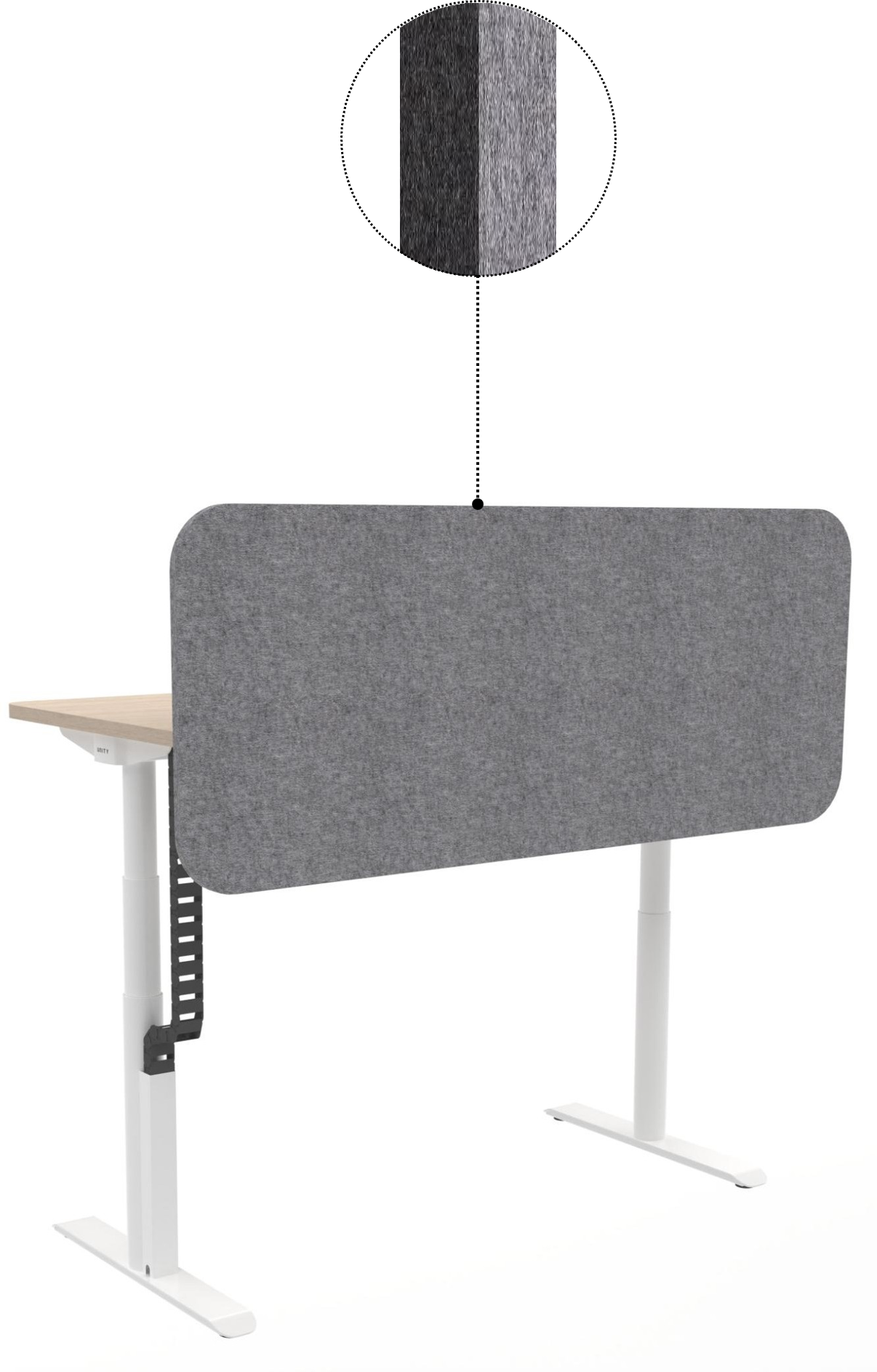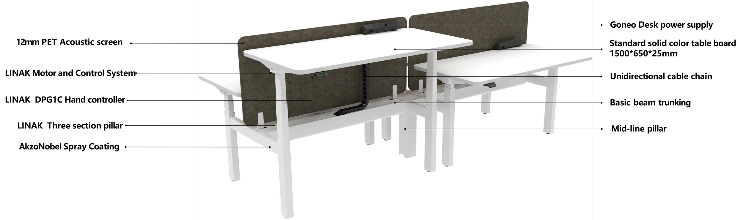 The screen rises and falls with the tabletop, providing better privacy and sound absorption performance. The 12mm PET screen ensures cost- effectiveness and offers multiple color options.Bench Table PET table screen
